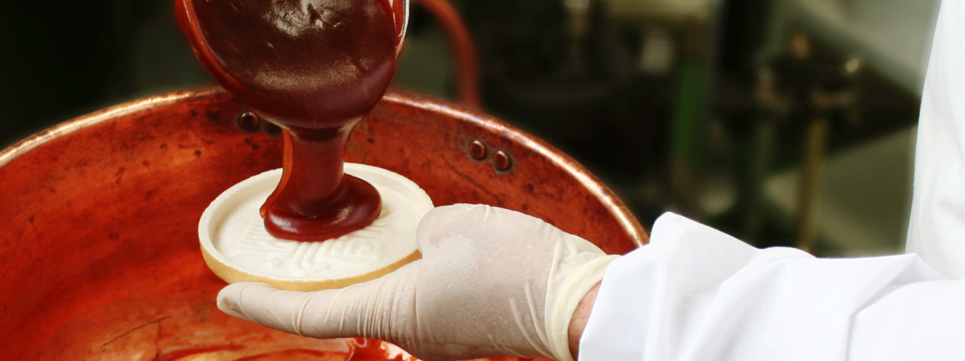 丁寧に炊いた白手餡を紅色に着色し、職人が一つ一つ最中に流し込みます。